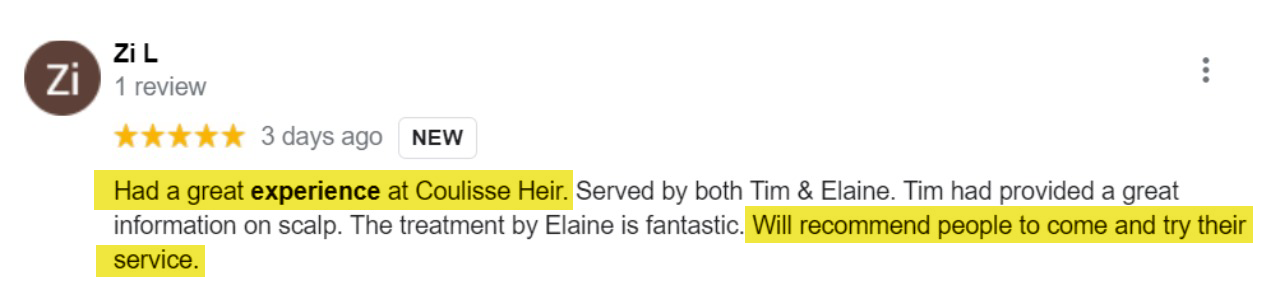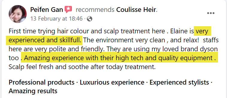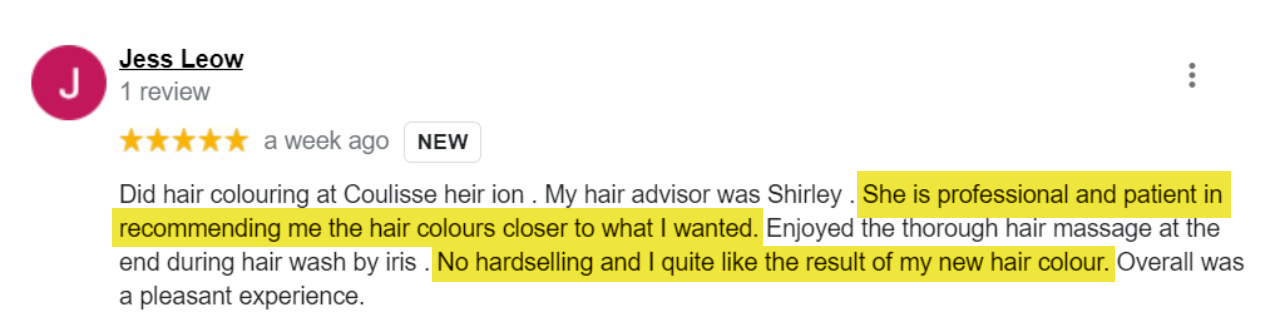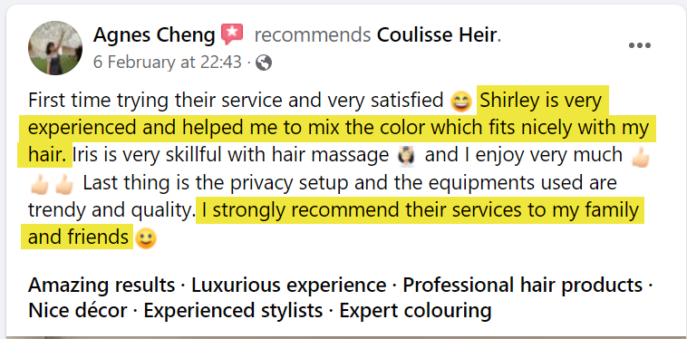 We do not condone or subject any of our clients to any form of pressure-selling. Here in Coulisse Heir, we believe that the performance of our service is the main reason why we have attracted strong and loyal customers. We ensure the best and most suitable hair color & treatment according to different hair types and that is what our customers appreciate in our service.